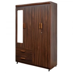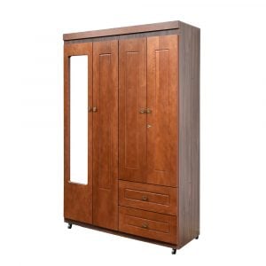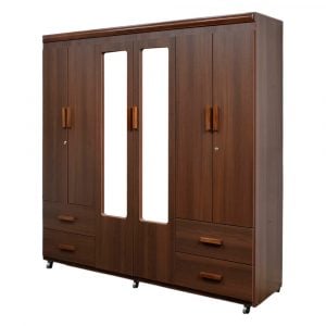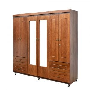 Melamina con madera roble. 6 rodos. 2 chapas. 2 sercheros. 2 espejos. 4 gavetas con riel