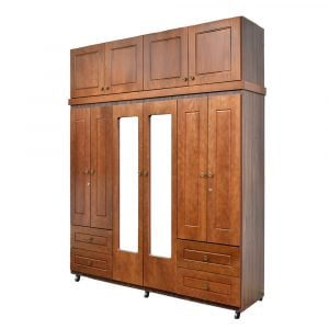 Melamina con madera roble. 6 rodos. 2 chapas. 2 sercheros. 2 espejos. 4 gavetas con riel. Pintura poliuretanica