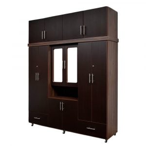 Melamina bi tono. Jalador acero inoxidable. 6 rodos. 2 chapas. 2 sercheros. 2 espejos.  2 gavetas con riel