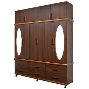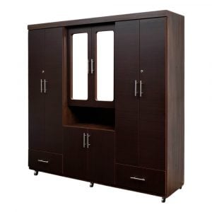 Tres piezas. Melanina con madera sólida, 6 rodos, 2 chapas, 2 Sercheros, 2 espejos, seis gavetas con riel