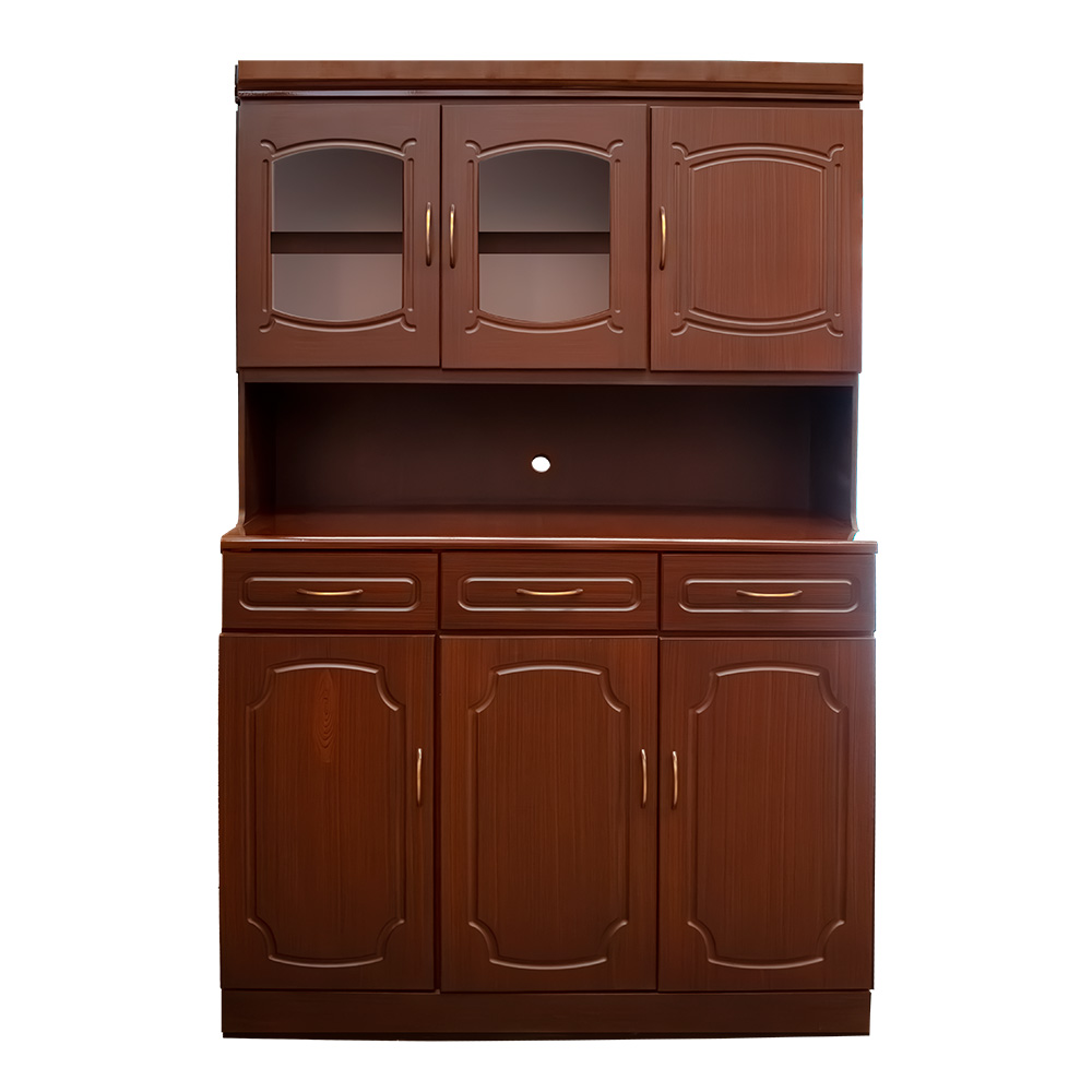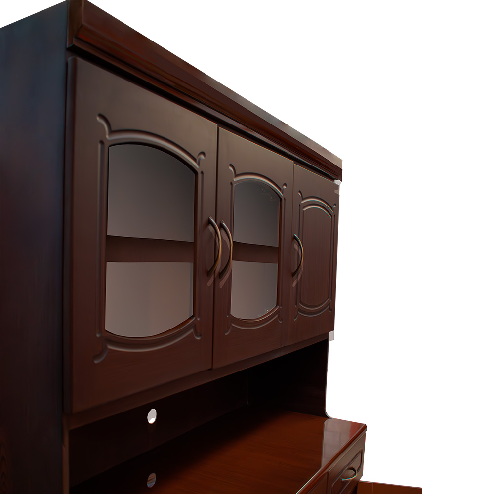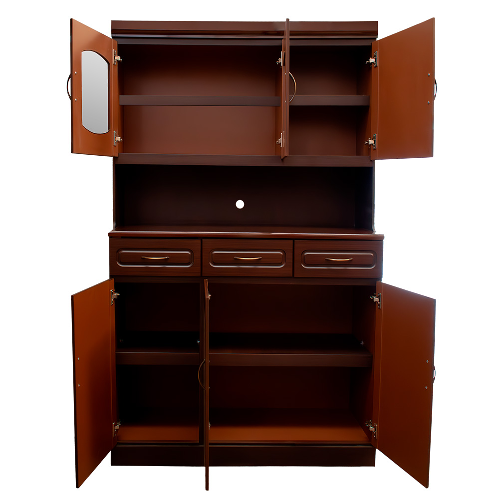 4 cuerpos, 2 gavetas, 2 espejos, rodos para facilitar movimiento, elaborado en melamina