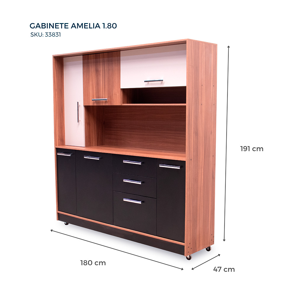 3 cuerpos, 4 gavetas, rodos para facilitar movimiento, elaborado en melamina