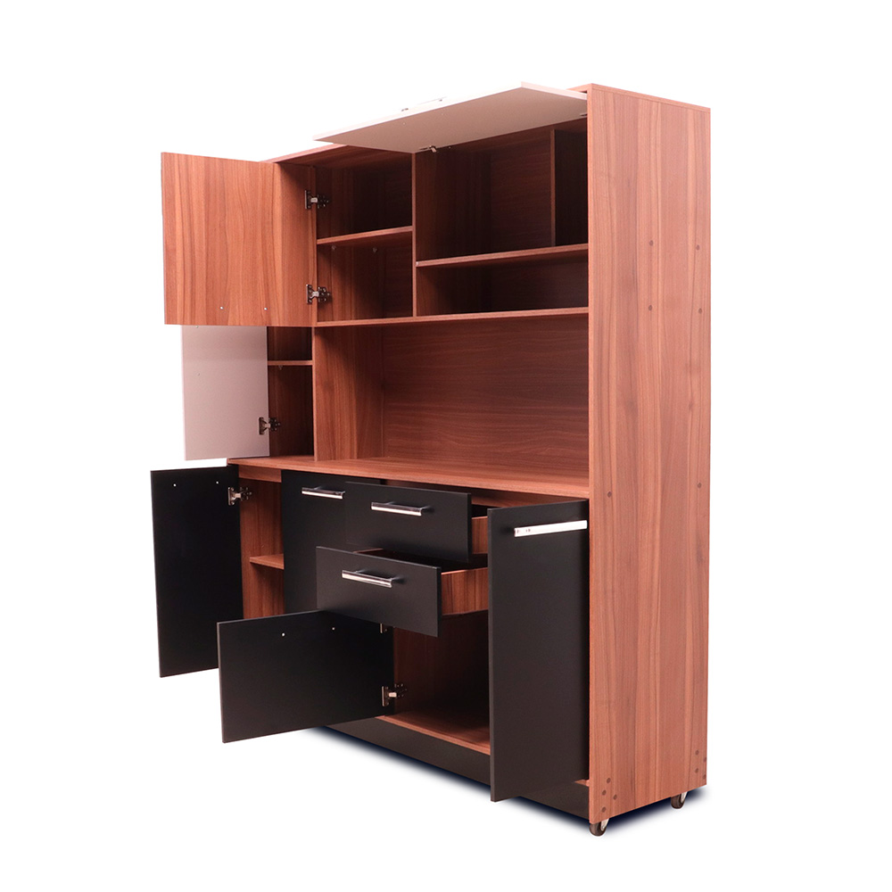 4 cuerpos, 2 gavetas, 2 espejos, rodos para facilitar movimiento, elaborado en melamina