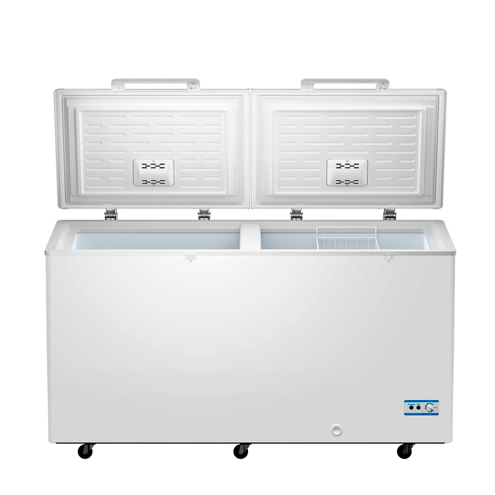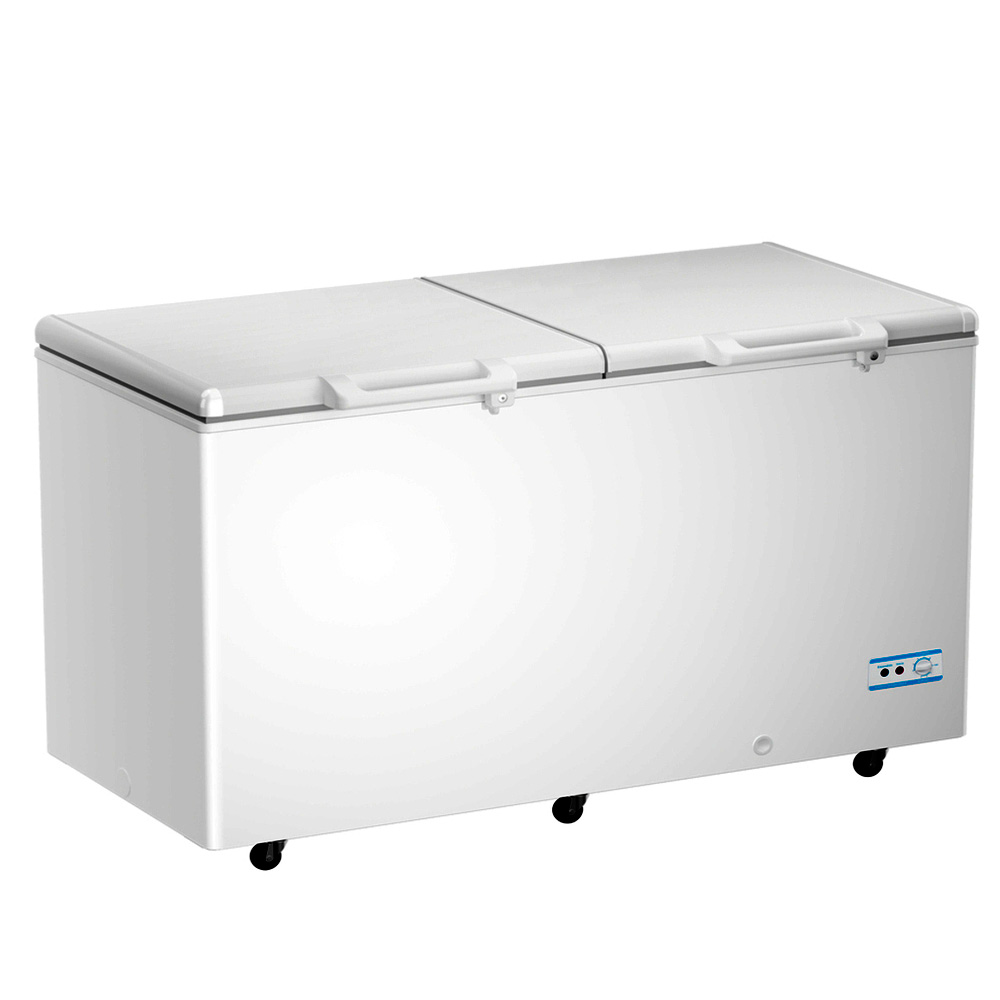 420 litros, horizontal tapa sólida, Drenaje frontal, Chapa de seguridad, Rodos resistentes