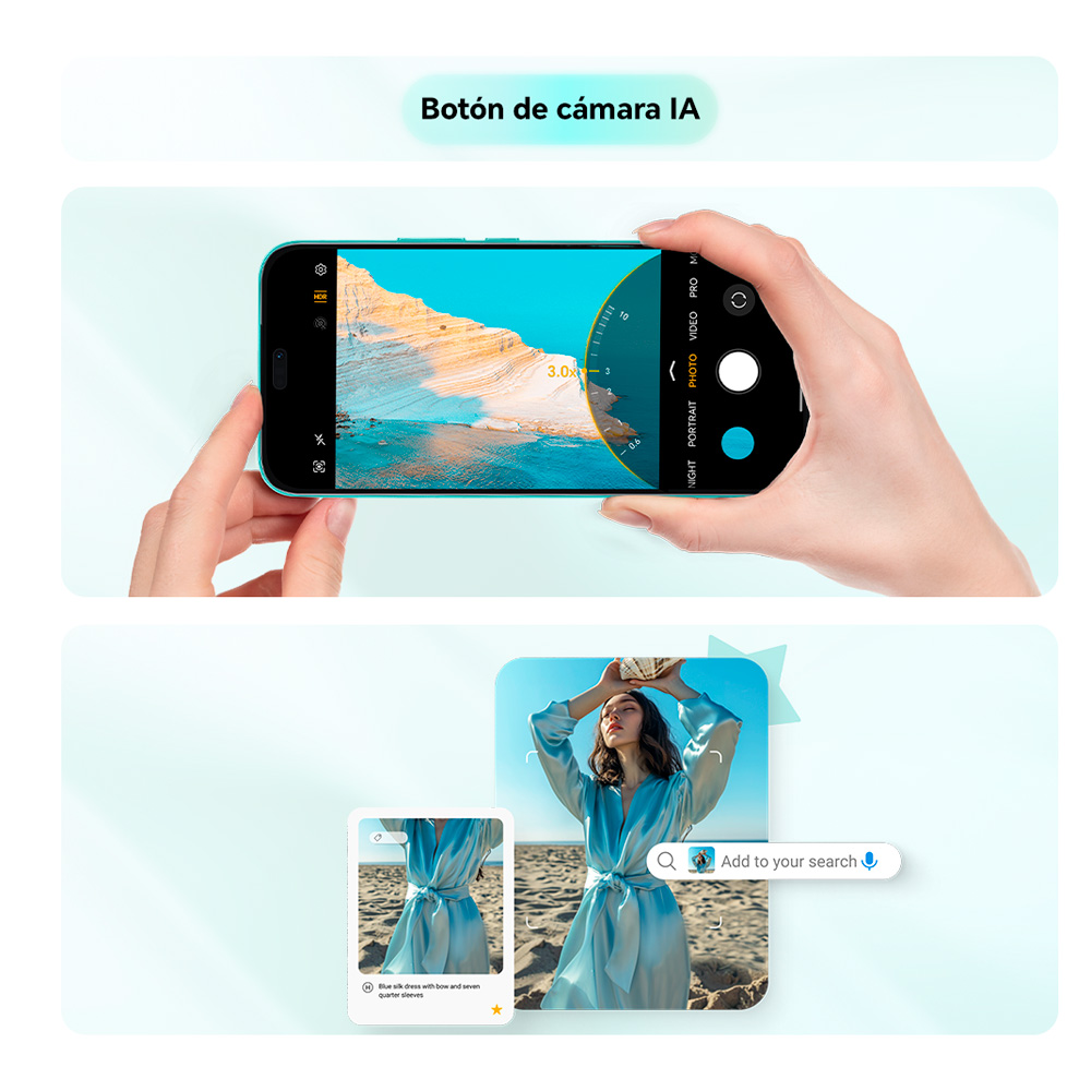 Pantalla de 6.64 pulgadas, sistema de cámaras con 50 MP y tecnología Quad Pixel, sensibilidad 4 veces mejor en ambientes con poca luz para tomar fotos más nítidas y reales, funciones de AI como Night Vision, HDR y modo retrato