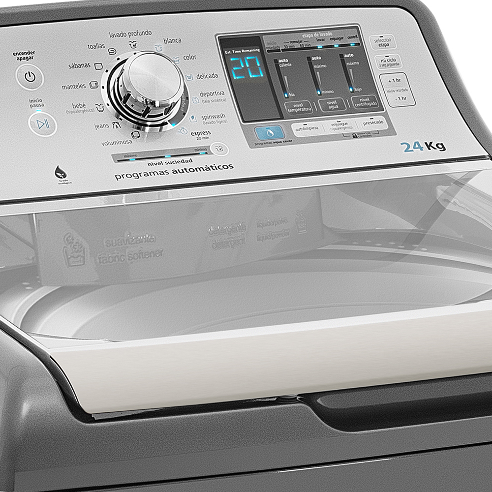 Carga superior, 20Kg, con agitador, tamaños de carga con SmartLoad, llenado manual, 12 ciclos de lavado