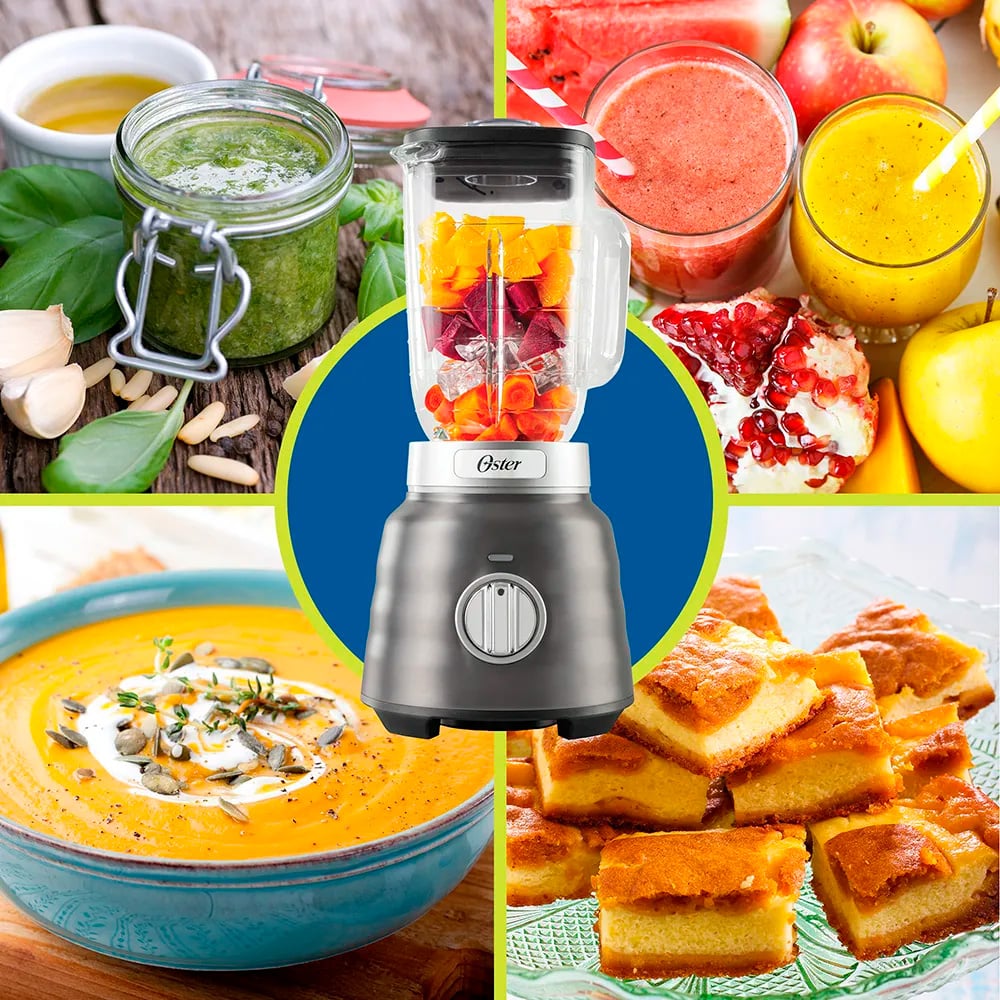 Jarra de vidrio, Clasica Oster, potente motor de 600 vatios, pulveriza hielo con la cuchilla trituradora de hielo, refractario Boroclass medidora