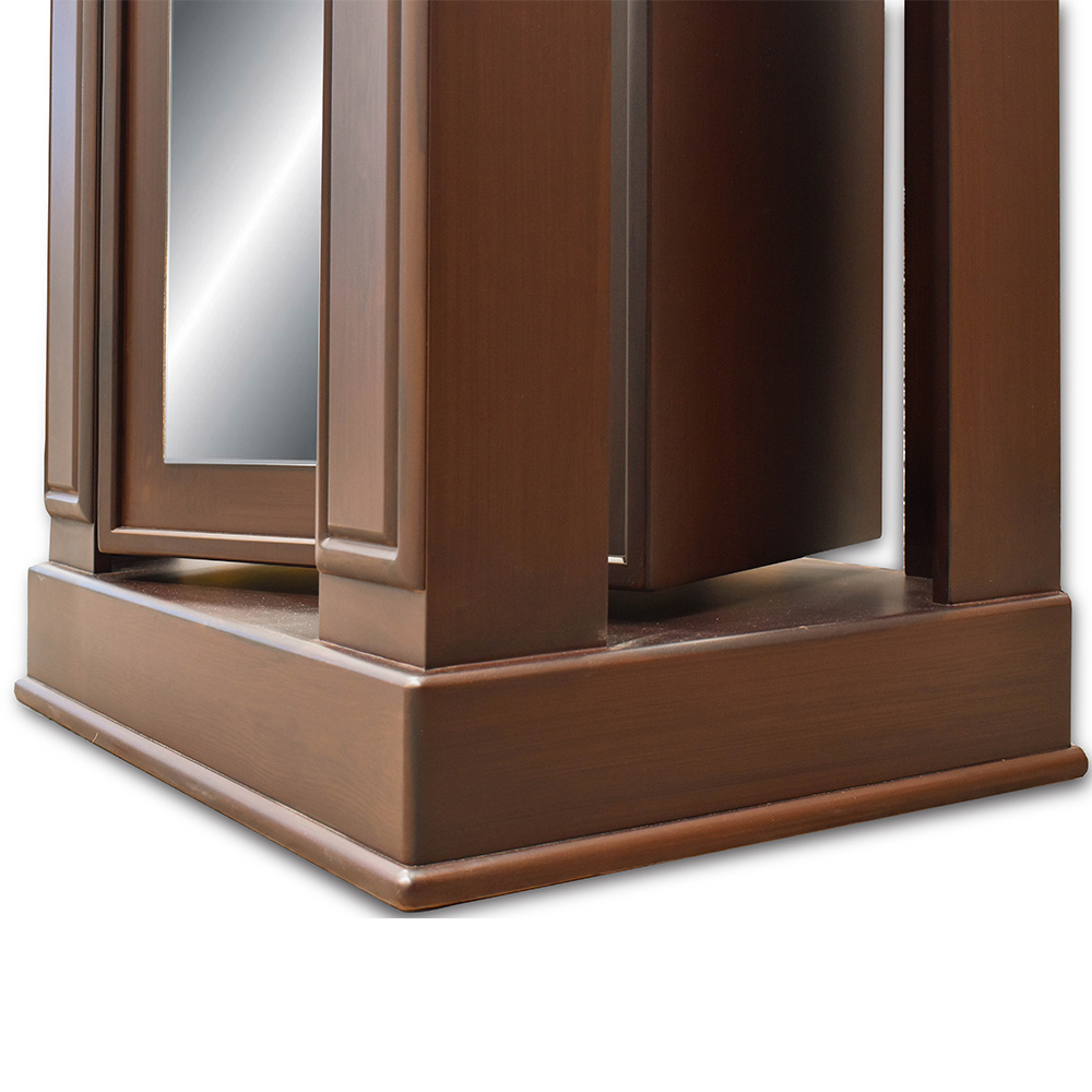 4 cuerpos, 2 gavetas, 2 espejos, rodos para facilitar movimiento, elaborado en melamina