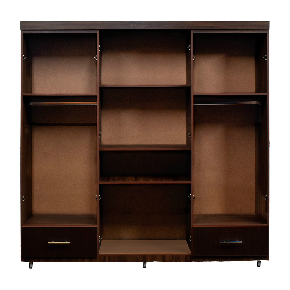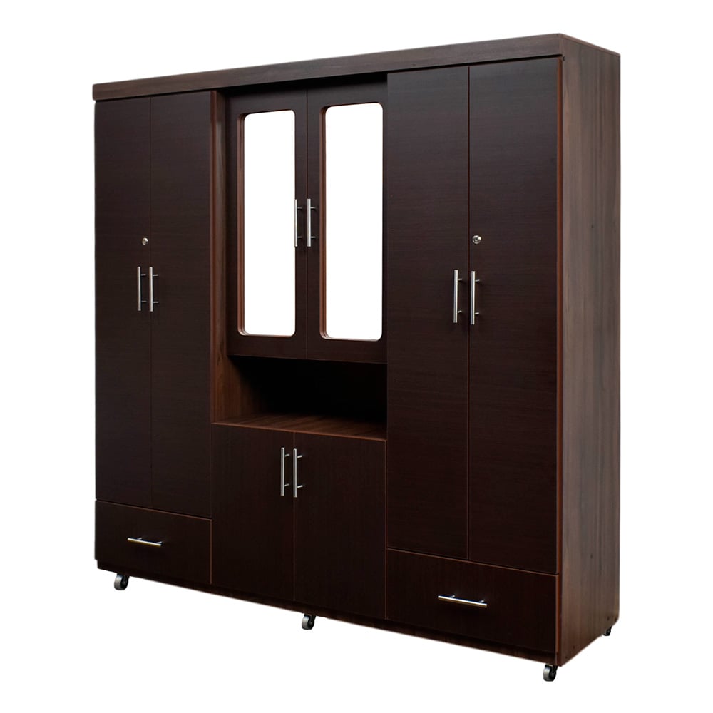 4 cuerpos, 2 gavetas, 2 espejos, rodos para facilitar movimiento, elaborado en melamina