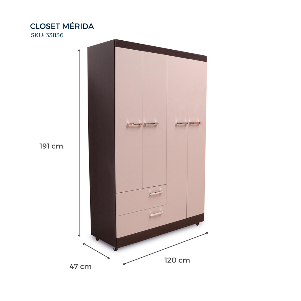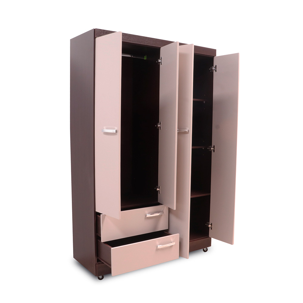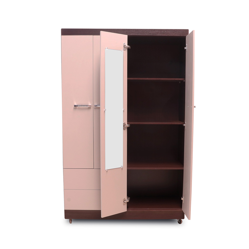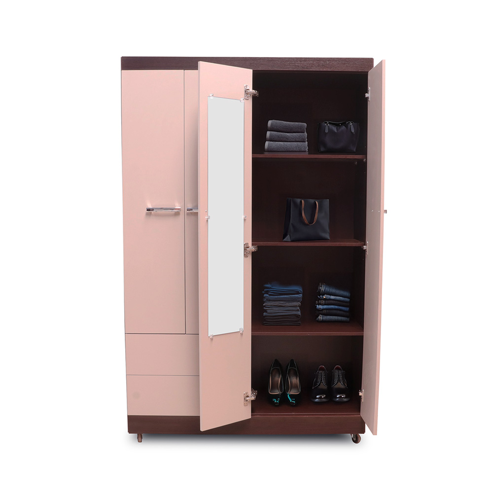 4 cuerpos, 2 gavetas, 2 espejos, rodos para facilitar movimiento, elaborado en melamina