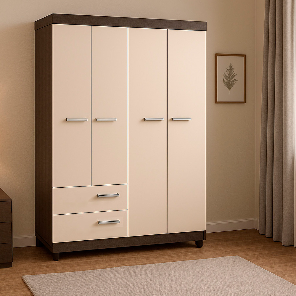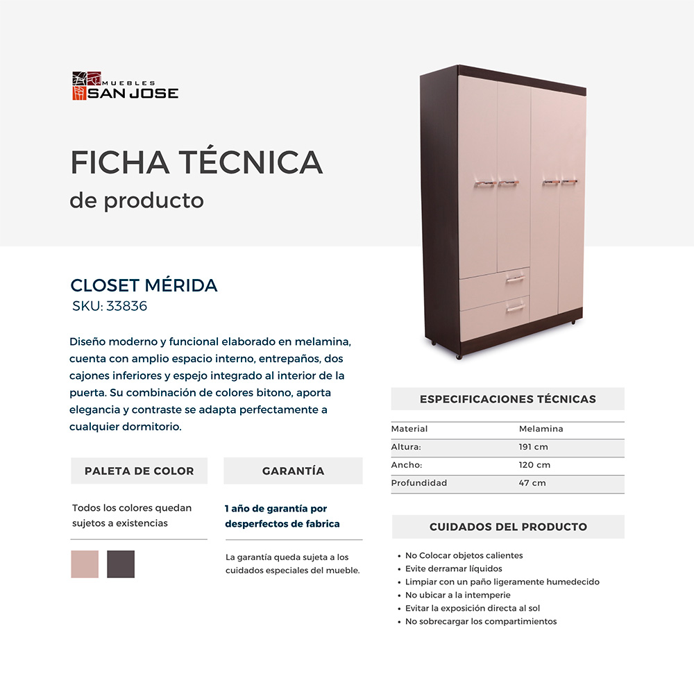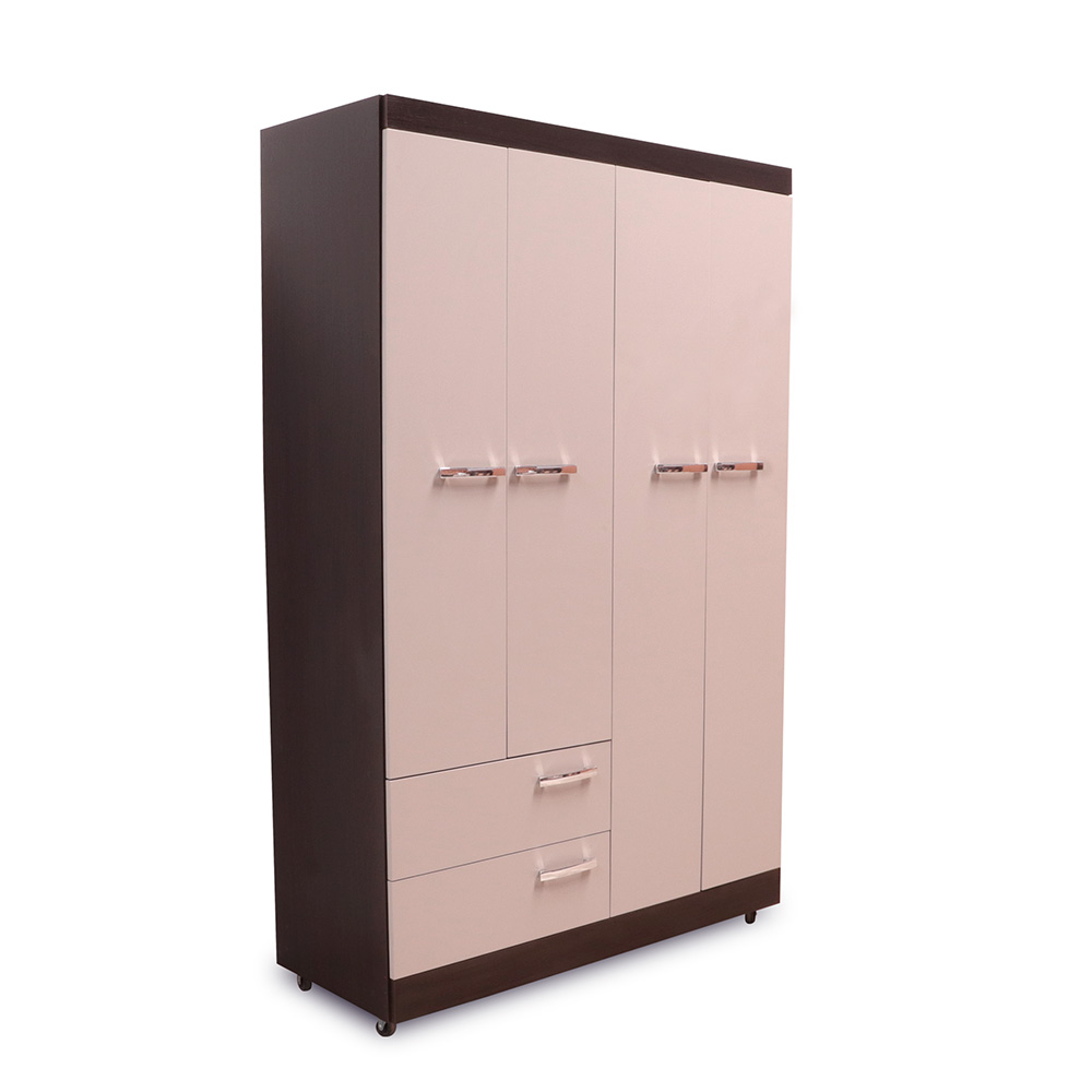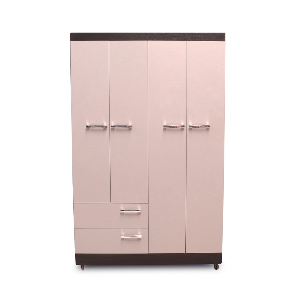 4 cuerpos, 2 gavetas, 2 espejos, rodos para facilitar movimiento, elaborado en melamina