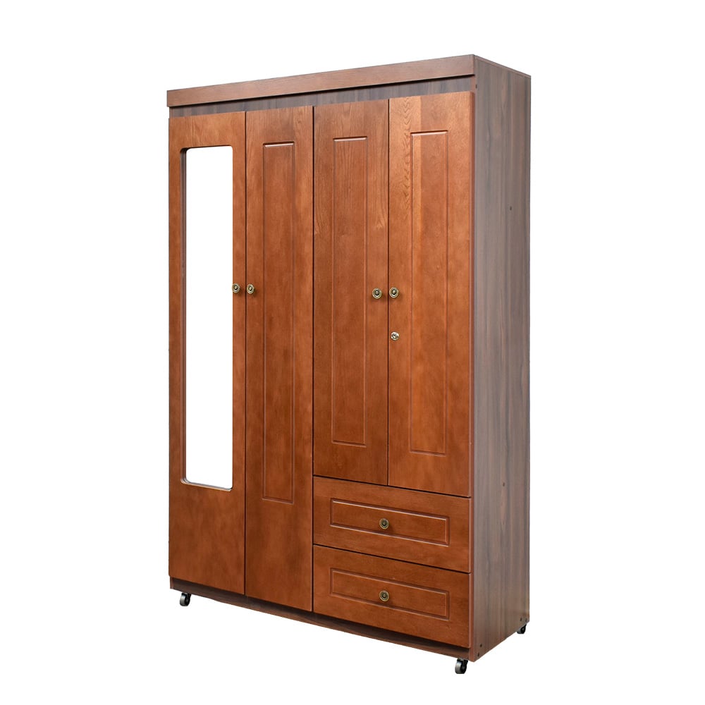 4 cuerpos, 2 gavetas, 2 espejos, rodos para facilitar movimiento, elaborado en melamina